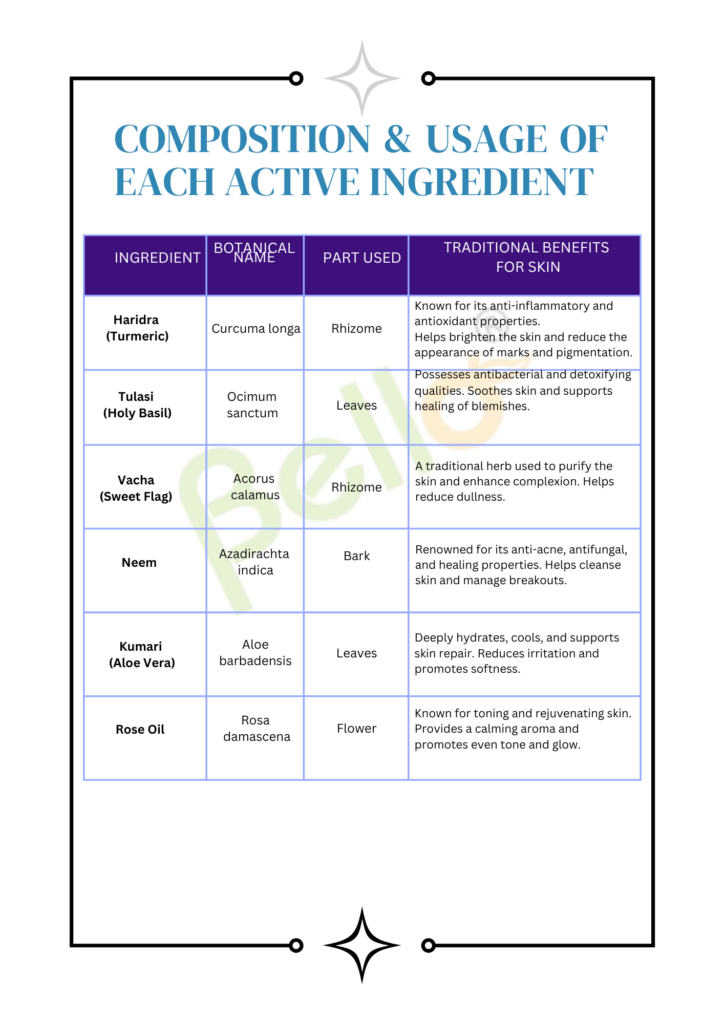 ✔️ Made with natural herbal ingredients ✔️ Inspired by trusted Ayurvedic skincare traditions ✔️ No harsh chemicals or bleaching agents ✔️ Gentle yet effective on all skin types ✔️ Suitable for both men and women